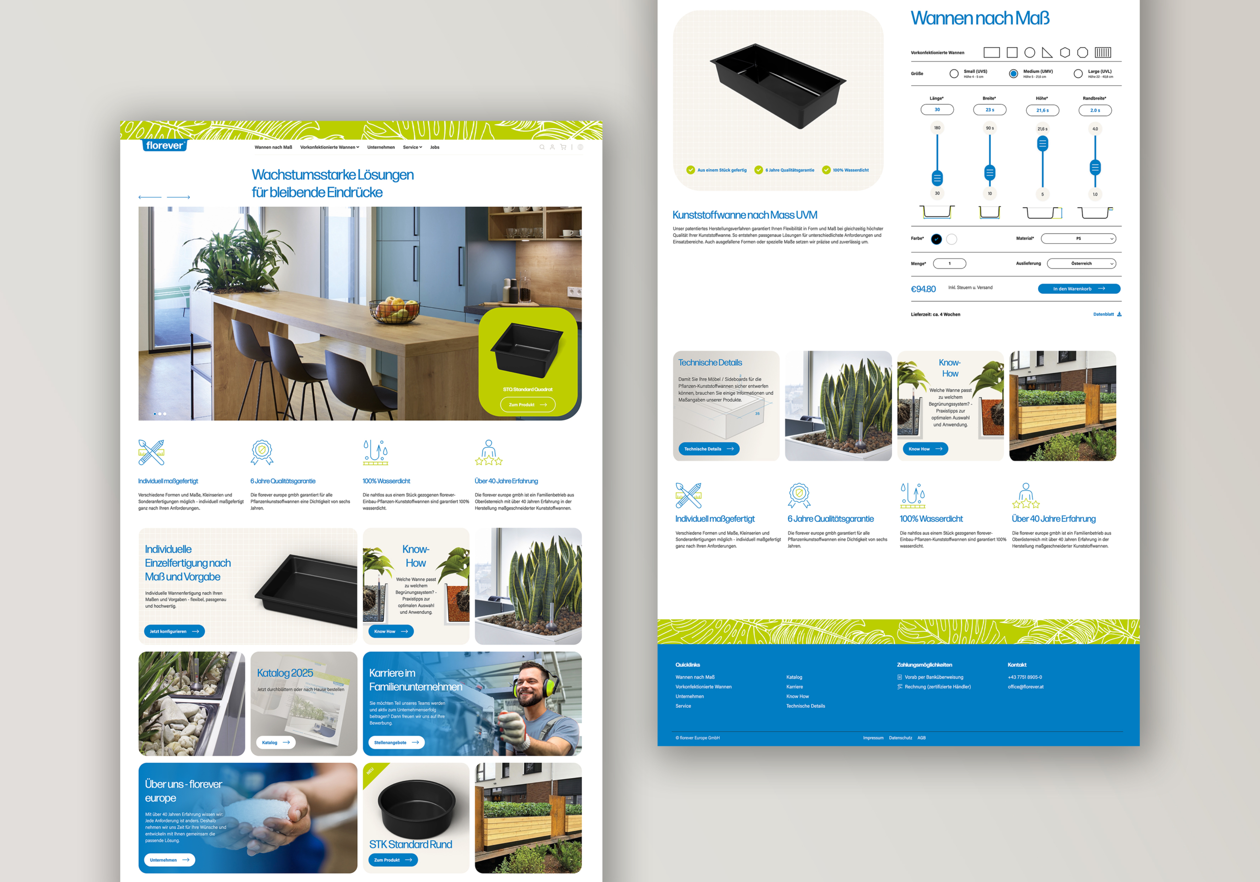 Ein besonderes Highlight des Projekts ist der Online-Produktkonfigurator, mit dem Kundinnen und Kunden maßgefertigte Pflanzwannen individuell nach Form und Größe konfigurieren können. Ergänzt wird das System durch ein Mega Drop-down Menü mit direkter Produktauswahl, sowie einem Katalog-Download, der den B2B-Einkaufsprozess deutlich erleichtert. Außerdem haben wir eine mehrsprachige Struktur implementiert, die eine komfortable Nutzung und Pflege der Inhalte in mehreren Sprachen ermöglicht.
